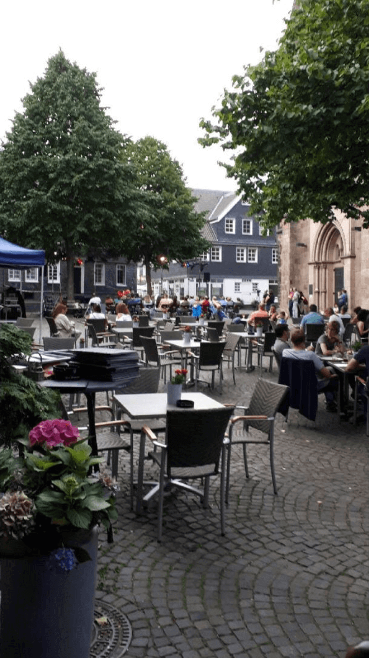 Sehr schöne nostalgische Kneipe mit umfangreicher Speisekarte. Im Sommer bei schönem Wetter ein Aussenbereich unter Bäumen vor der Kirchfassade auf einem Bergischen Rundplatz. Die Atmosphäre sowohl aussen als auch innen ist wie Ferien im eigenen Ort.